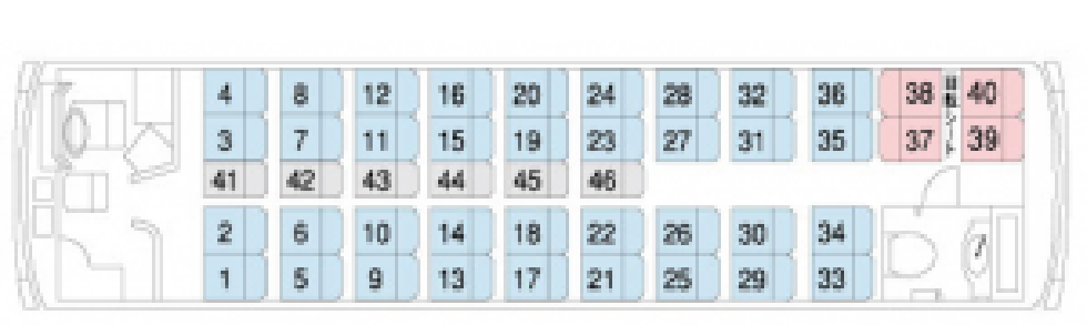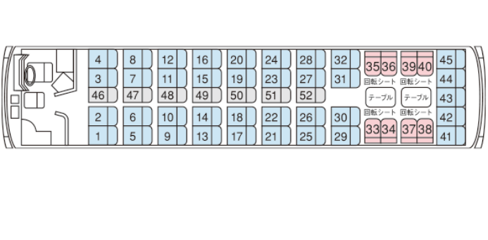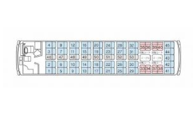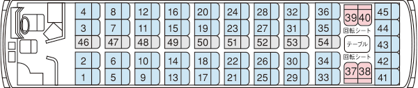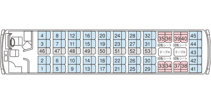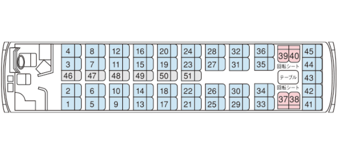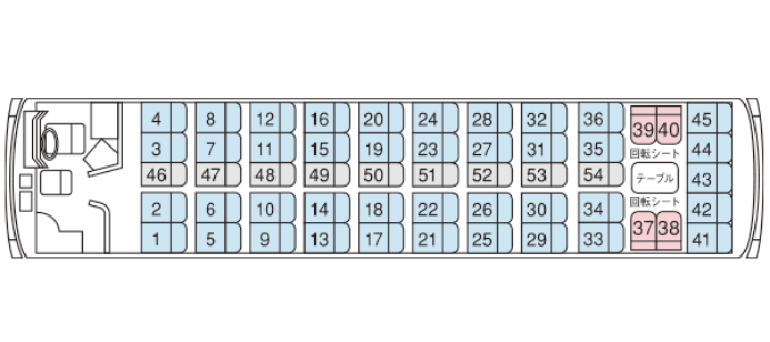 定員46名(正席40+補助席6) 後方席をサロンシートに変形することはできません