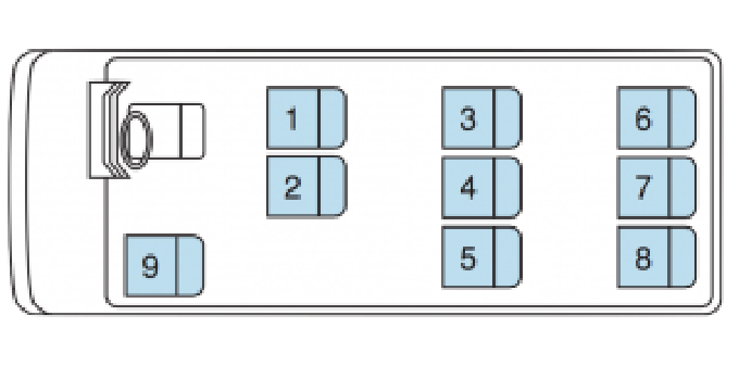 少人数グループでのプチ旅行やご移動に。定員9名(正席9+補助席なし)。