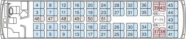 定員51名(正席45+補助席6) 後方席はサロンシートに変形できます(9席)